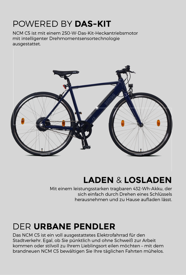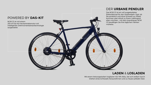 DESIGN UND ERGONOMIE: Das C5 wurde speziell für den Stadtverkehr entwickelt und bietet eine hohe Vielseitigkeit. Es zeichnet sich durch ein klares Design mit einem vollständig integrierten Akku und einem Aluminiumrahmen aus, was es zum leichtesten NCM-Modell macht. Ausgestattet mit dem im Lenker integrierten Das-Kit E2 Display für schnellen und einfachen Zugriff können Sie die 3 Modi der elektrischen Tretunterstützung einstellen. Sie können den Akkustand des C5 jederzeit im Blick behalten.